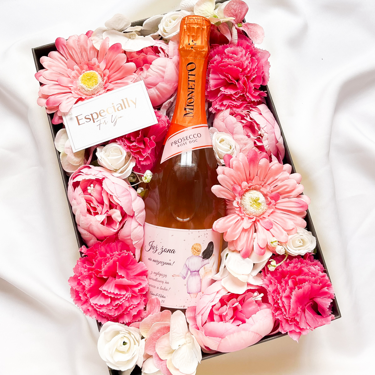 Butelka z Twoją dedykacją w obłędnym pudełku pełnym kwiatów podkreśli wyjątkowość chwili.