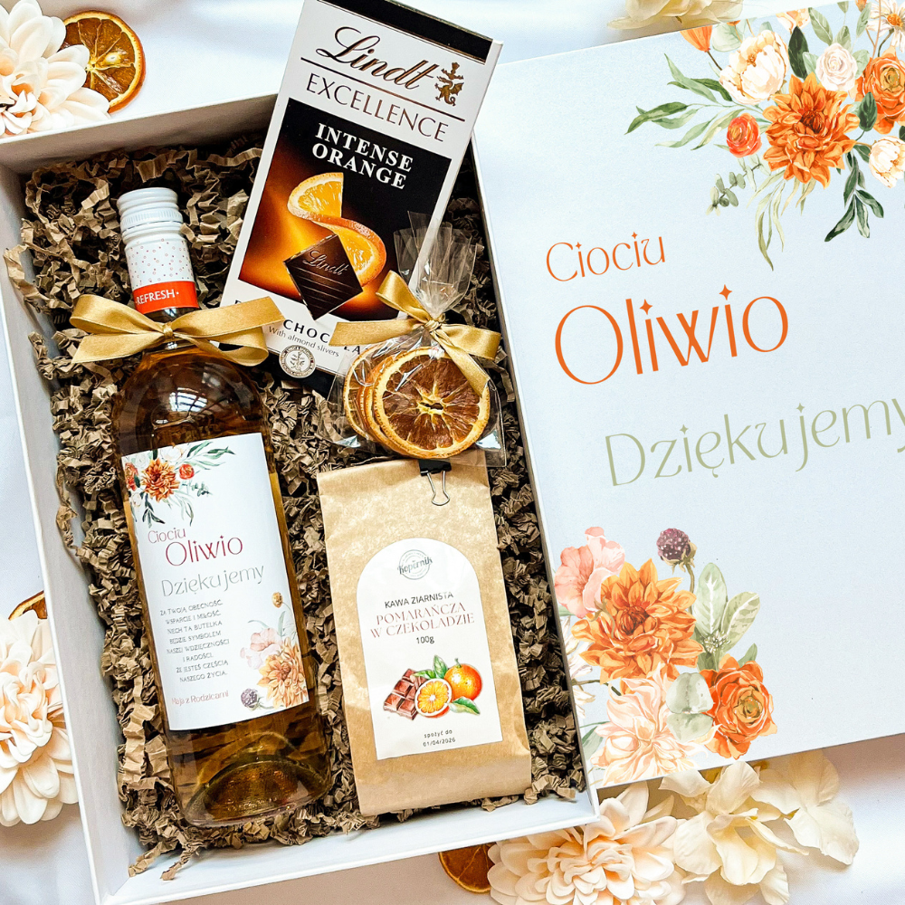 Delikatne wino, subtelna kawa z nutą pomarańczy i czekolady oraz ręcznie dobrana słodycz tworzą harmonijny zestaw, który zachwyca smakiem i estetyką. To upominek, który nie tylko umili chwile relaksu, ale również pozostawi ciepłe wspomnienie i przypomnienie o tej szczególnej więzi. Idealny na wręczenie po ceremonii chrztu lub podczas spotkania rodzinnego z okazji tej wyjątkowej decyzji.