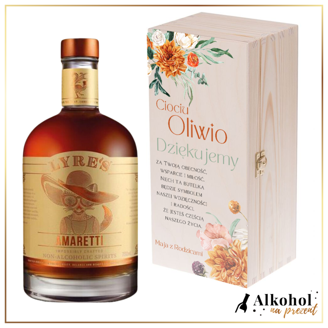 DZIĘKUJEMY CIOCIU LIKIER BEZALKOHOLOWY LYRE'S AMARETTI W SKRZYNCE Z NADRUKIEM - PREZENT DLA CHRZESTNYCH