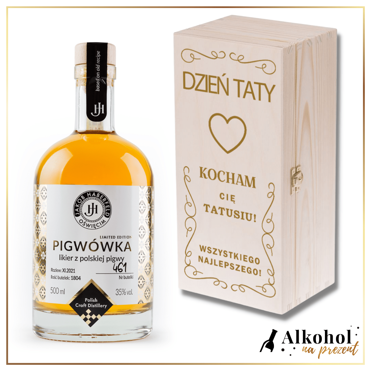 DZIEŃ TATY LIKIER JAKOB HABERFELD PIGWÓWKA 0.5L W SKRZYNCE Z NADRUKIEM - PODARUNEK NA DZIEŃ TATY