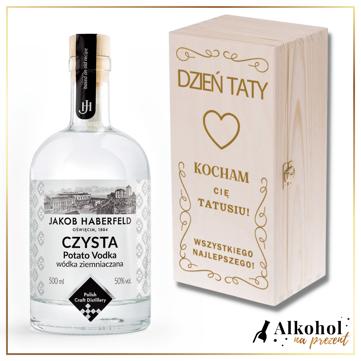 DZIEŃ TATY WÓDKA JAKOB HABERFELD CZYSTA 0.5L W SKRZYNCE Z NADRUKIEM - UPOMINEK NA DZIEŃ TATY