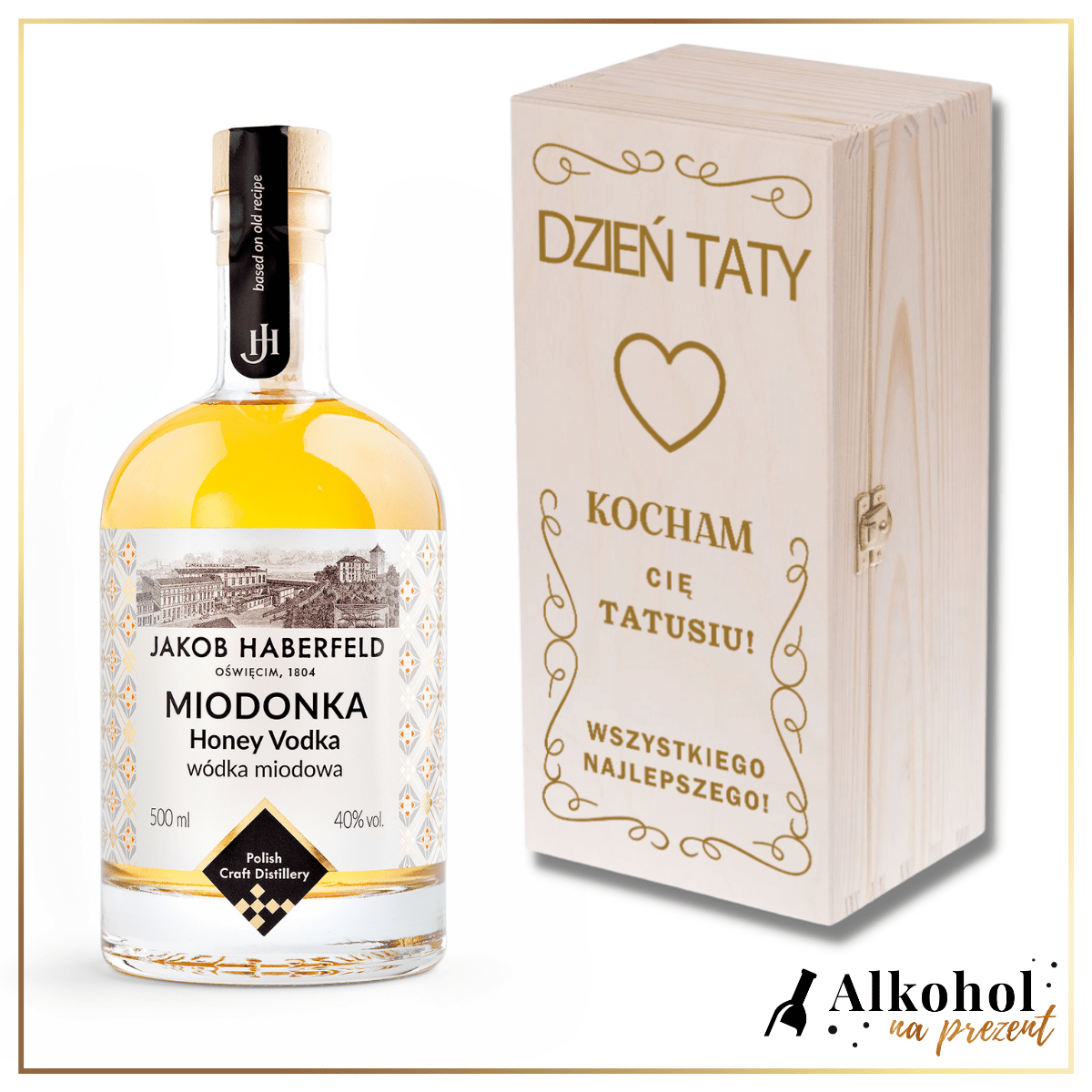 DZIEŃ TATY WÓDKA JAKOB HABERFELD MIODONKA 0.5L W SKRZYNCE Z NADRUKIEM - UPOMINEK DLA TATY