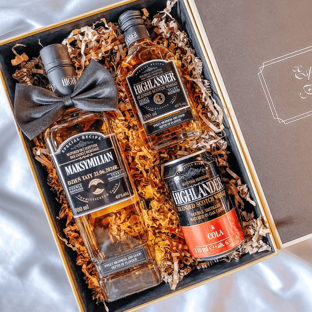 1. Whisky Highlander 0,7L z Personalizowaną Etykietą na Dzień Ojca: Główny i najbardziej okazały element zestawu. Butelka szkockiej whisky Highlander o pojemności 0,7L, której etykieta jest specjalnie personalizowana z myślą o Dniu Ojca. Można na niej umieścić imię Taty, życzenia, dedykację lub inny tekst, czyniąc prezent niezwykle osobistym i pamiątkowym.