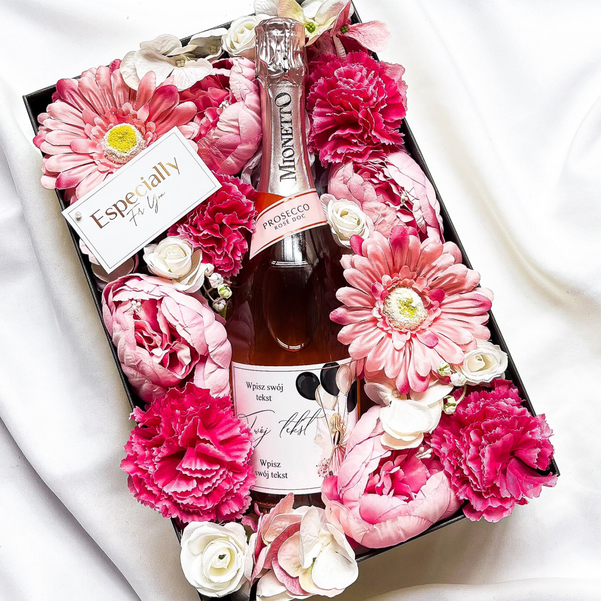 Butelka z Twoją dedykacją w obłędnym pudełku pełnym kwiatów podkreśli wyjątkowość chwili. Kwiaty na prezent to zawsze strzał w 10!