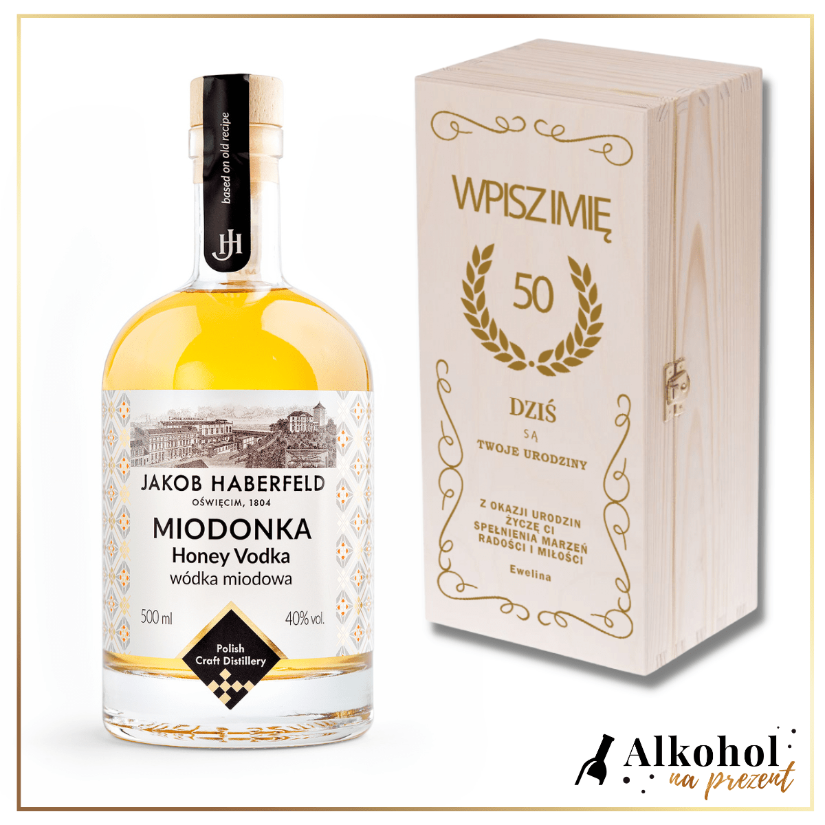ELEGANCKIE ŻYCZENIA URODZINOWE WÓDKA JAKOB HABERFELD MIODONKA 0.5L W SKRZYNCE Z NADRUKIEM - URODZINOWY UPOMINEK