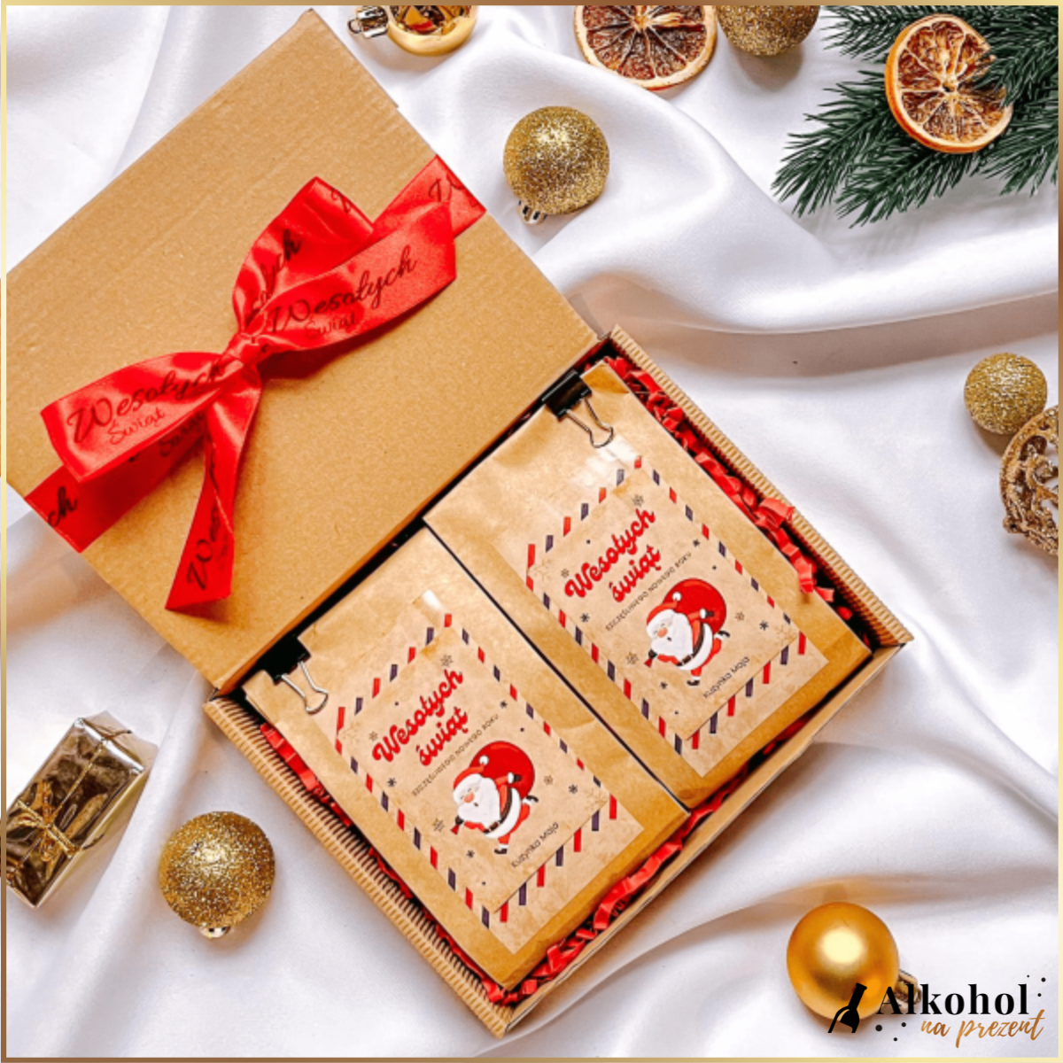 Elegancki zestaw dwóch eko paczek zawierający starannie wyselekcjonowaną kawę mieloną lub ziarnistą. Opakowanie eko, w środku kawa w świątecznej torebce, dla osób, które kochają klimat świąt i piękne detale. Pudełko oplecione elegancką wstążką z napisem "Wesołych Świąt".