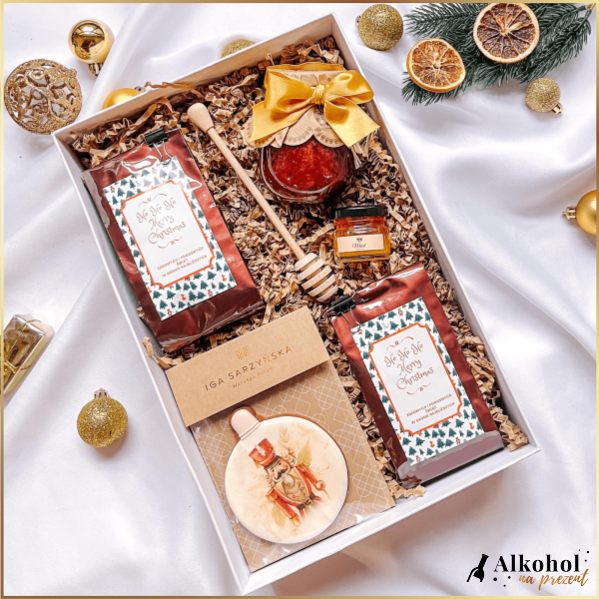 Elegancki zestaw dwóch paczek zawierający starannie wyselekcjonowaną kawę mieloną lub ziarnistą ze słodyczami. Opakowanie, w środku kawa w świątecznej torebce oraz konfitura, miód, piernik, dla osób, które kochają klimat świąt i piękne detale.