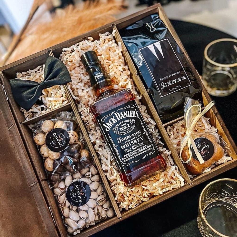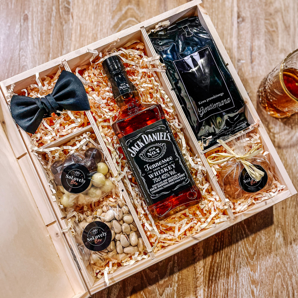 JACK DANIEL'S + DREWNIANE PUDEŁKO ZE SŁODYCZAMI - PREZENT DLA MĘŻCZYZNY