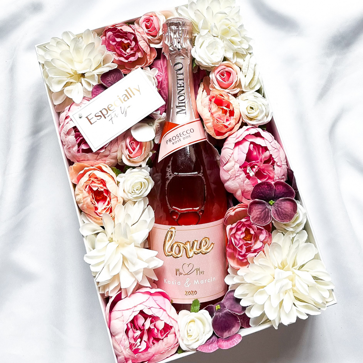 Butelka z Twoją dedykacją w obłędnym pudełku pełnym kwiatów podkreśli wyjątkowość chwili.