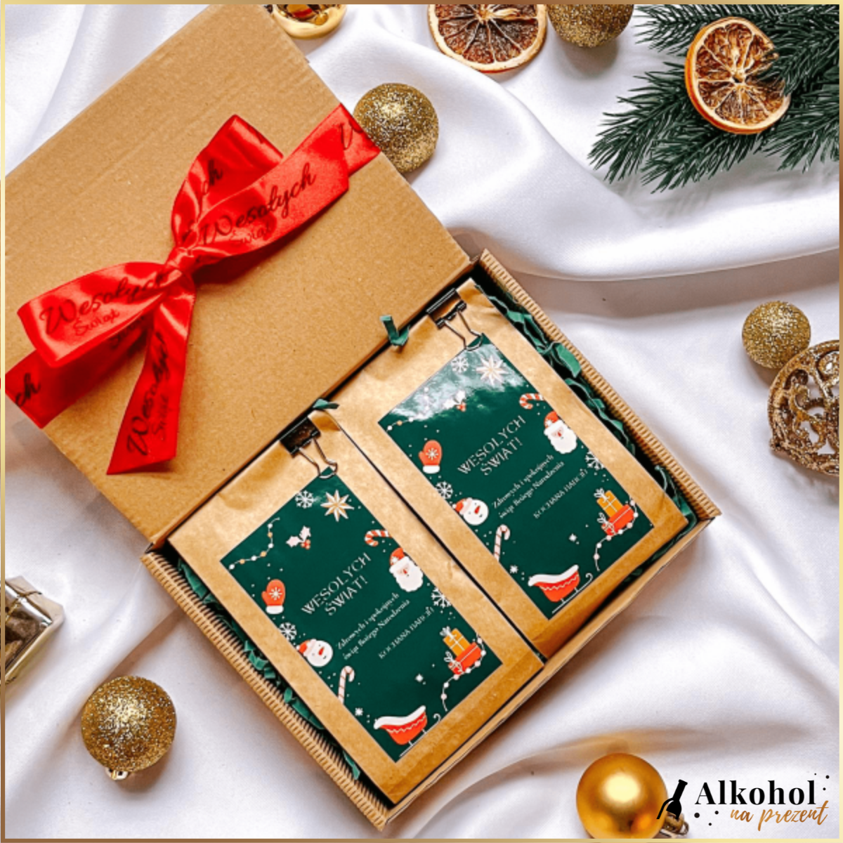 Elegancki zestaw dwóch eko paczek zawierający starannie wyselekcjonowaną kawę mieloną lub ziarnistą. Opakowanie eko, w środku kawa w świątecznej torebce, dla osób, które kochają klimat świąt i piękne detale. Pudełko oplecione elegancką wstążką z napisem "Wesołych Świąt".