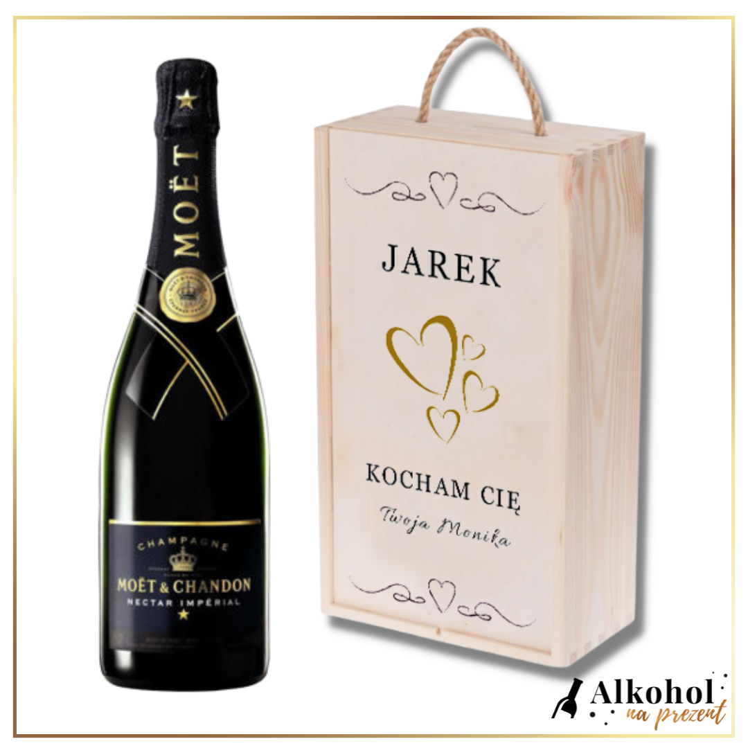 MIŁOSNY SZAMPAN MOET & CHANDON NECTAR IMPERIAL W DREWNIANEJ SKRZYNCE Z WŁASNYM TEKSTEM