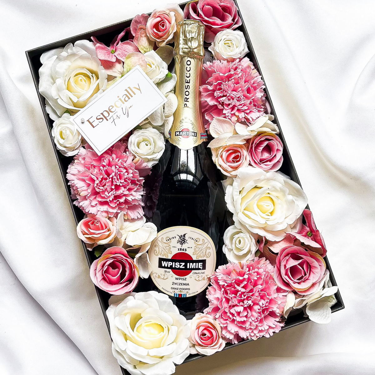 Butelka z Twoją dedykacją w obłędnym pudełku pełnym kwiatów podkreśli wyjątkowość chwili. Kwiaty na prezent to zawsze strzał w 10!