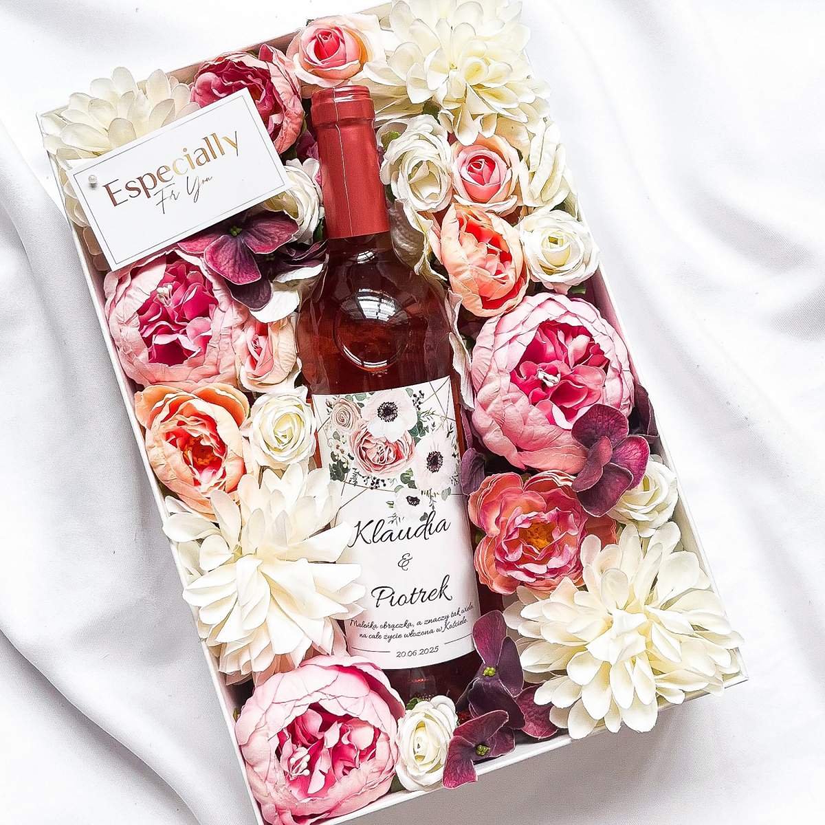 Butelka z Twoją dedykacją w obłędnym pudełku pełnym kwiatów podkreśli wyjątkowość chwili. Kwiaty na prezent na ślub to zawsze strzał w 10!