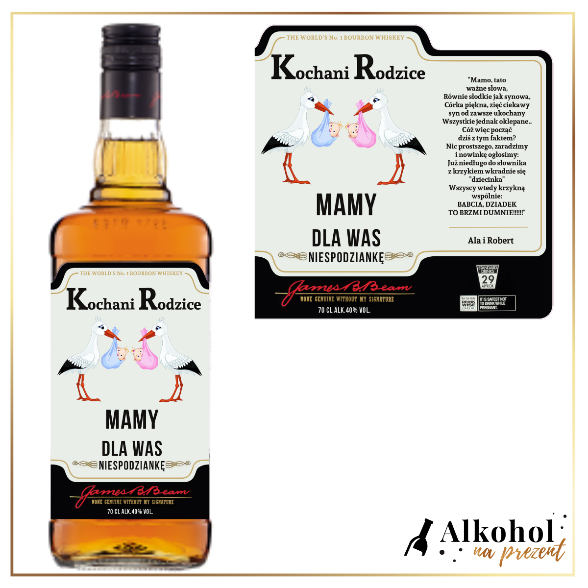 Szukasz idealnego sposobu, by przekazać wyjątkową nowinę, która na zawsze odmieni życie Twoich rodziców? Butelka Jim Beam White z personalizowaną etykietą to niezwykle wzruszający i pomysłowy podarunek, który zamieni ten moment w bezcenną pamiątkę. To gotowy do wręczenia symbol nowej roli, pełnej miłości i radości.