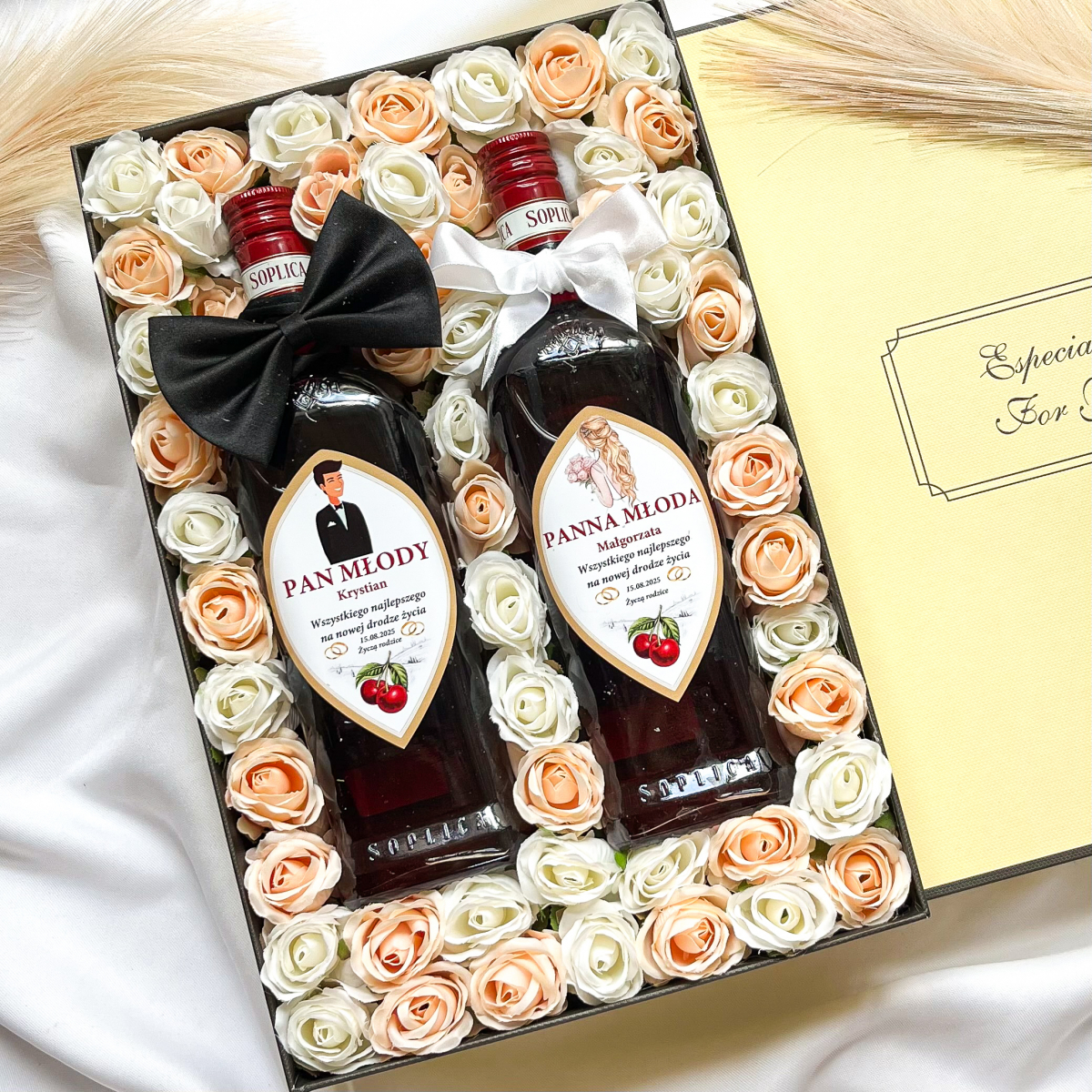 Szukasz niebanalnego prezentu na ślub, zaręczyny, rocznicę lub inną wyjątkową okazję dla pary zakochanych? Zestaw „Pan i Panna Młoda” z elegancką butelką Soplicy Wiśniowej to idealne połączenie klasyki, estetyki i emocjonalnego przekazu. Utrzymany w subtelnej kolorystyce kremowych róż i wykończony personalizacją, ten upominek stanie się niezapomnianą pamiątką – pełną uroku, stylu i serca.