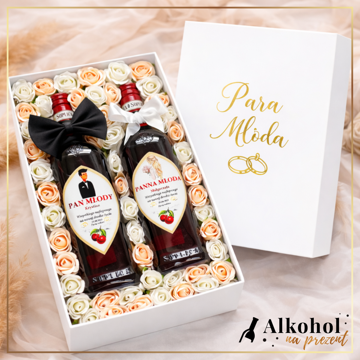 Ten romantyczny zestaw z Soplicą Wiśniową to coś znacznie więcej niż elegancki upominek – to prawdziwa opowieść zamknięta w pudełku. Dzięki możliwości personalizacji butelki, Twój prezent zyskuje indywidualny, sentymentalny wymiar. Starannie wykonane etykiety z podpisami „Pan Młody” i „Panna Młoda” to nie tylko piękna ozdoba – to symbol nowego rozdziału życia, wspólnej drogi i więzi, która właśnie się zacieśnia. Taka personalizacja czyni prezent niepowtarzalnym i sprawia, że staje się on nie tylko elementem uroczystości, ale i trwałą pamiątką ślubną. To idealny prezent na ślub, zaręczyny, rocznicę lub podziękowanie dla rodziców – stworzony z dbałością o detale, estetykę i emocjonalny przekaz. Łączy w sobie klasyczny smak polskiej Soplicy, romantyzm kwiatów i osobisty akcent w formie dedykowanej personalizacji. Taki zestaw mówi więcej niż słowa – staje się pięknym gestem, który zostanie z obdarowanymi na długo, nie tylko jako wspomnienie dnia, ale i jako symbol relacji, którą chcesz uczcić.
