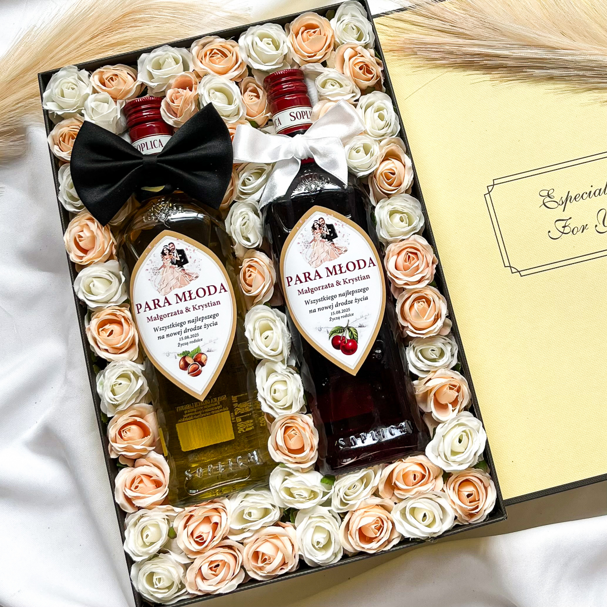 Dla nich obojga: wspólne, ozdobne opakowanie wręczone w jednym celu: by uczcić moment zaślubin. Zestaw Soplicy jako alkohol na prezent ślubny zamiast kwiatów jest propozycją, która znajduje uniwersalne zastosowanie. A całość, w wykwintnych, kremowych różach, prezentuje się wprost wspaniale.