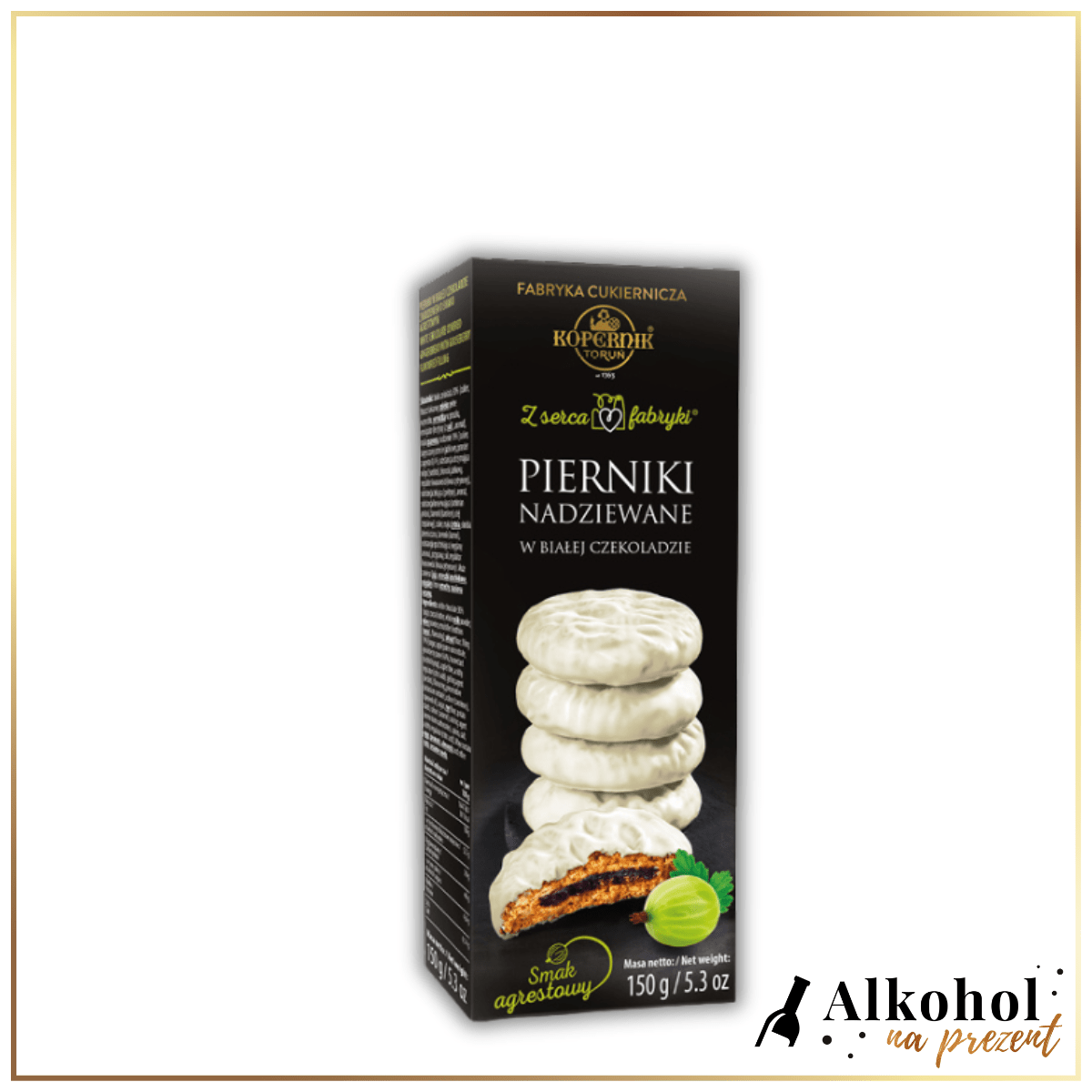 Poznaj niepowtarzalny smak Pierników w białej czekoladzie z nadzieniem o smaku agrestowym 150 g od legendarnej Fabryki Kopernik – producenta toruńskich pierników o wielowiekowej tradycji. Te wyjątkowe pierniki to połączenie delikatnego, korzennego ciasta z kremowym nadzieniem o wyrazistym, owocowym smaku agrestu. Całość oblana jest aksamitną, najwyższej jakości białą czekoladą, która doskonale podkreśla i równoważy intensywność owocowego wnętrza oraz charakterystyczny piernikowy aromat.