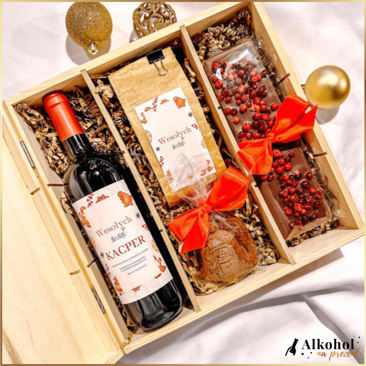 PIERNIKI ZESTAW WINO CZERWONE Z KAWĄ I SŁODYCZAMI W SKRZYNCE - PREZENT NA BOŻE NARODZENIE
