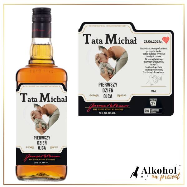Pierwszy Dzień Taty to kamień milowy, chwila pełna wzruszeń i niezapomnianych emocji. Uczcij ten wyjątkowy moment w życiu każdego świeżo upieczonego taty personalizowanym prezentem, który na zawsze pozostanie w jego pamięci. Nasza propozycja to klasyczna amerykańska whisky Jim Beam White w specjalnie zaprojektowanej odsłonie – z etykietą, którą możesz spersonalizować zdjęciem taty i dziecka oraz własnymi życzeniami.