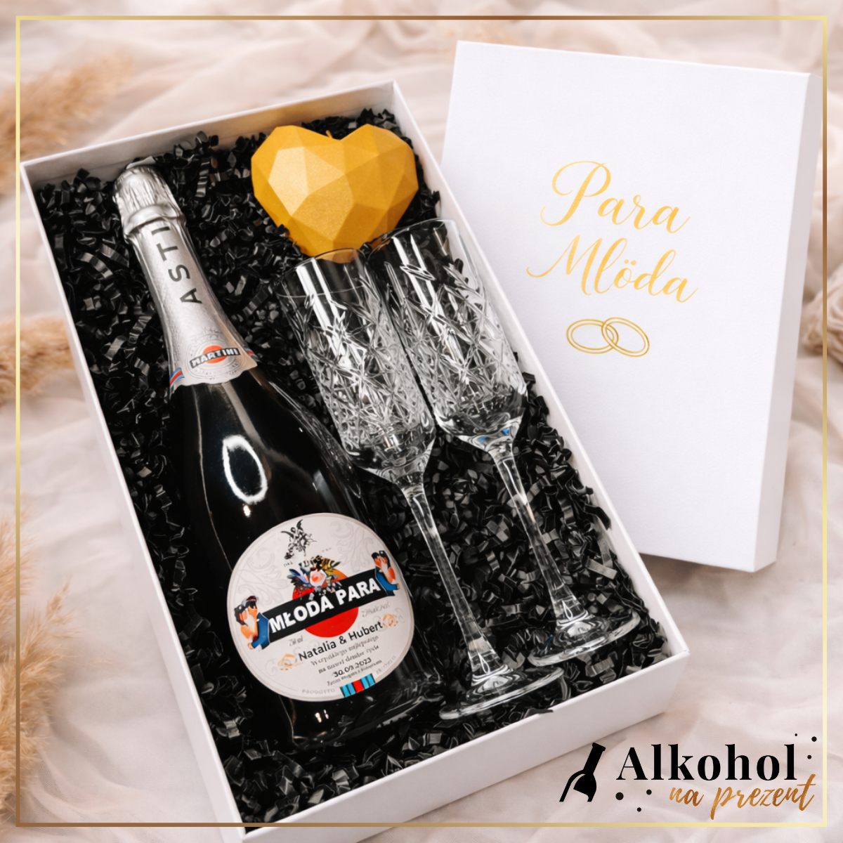 Celebrujcie miłość i nowy rozdział w życiu Młodej Pary, wręczając im starannie skomponowany ślubny zestaw, który łączy w sobie elegancję, romantyczny nastrój i osobisty akcent. Centralnym elementem tego wyjątkowego upominku jest butelka wybornego Martini Asti z personalizowaną etykietą, stworzoną specjalnie na tę doniosłą okazję. Dołączone do niej dwa eleganckie kieliszki do wina musującego oraz urokliwa świeczka w kształcie serca dopełniają całości, tworząc prezent, który zachwyci i wzruszy.