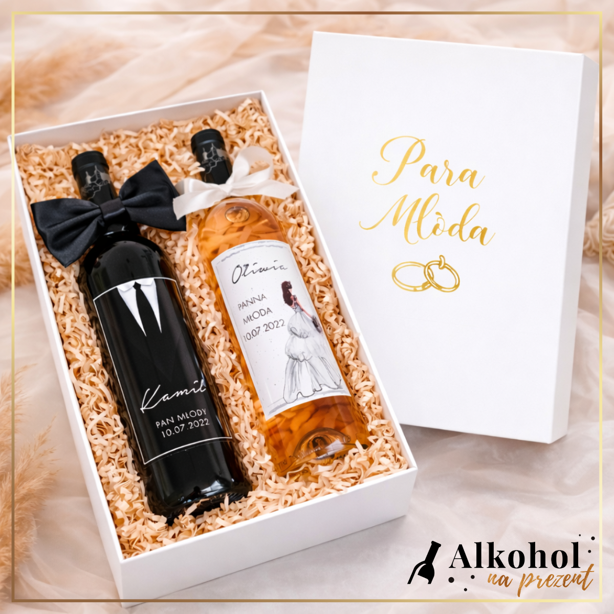 Każda butelka w zestawie zyskuje unikalny, osobisty charakter dzięki spersonalizowanym etykietom ślubnym. To detal, który sprawia, że prezent staje się niezapomnianą pamiątką.