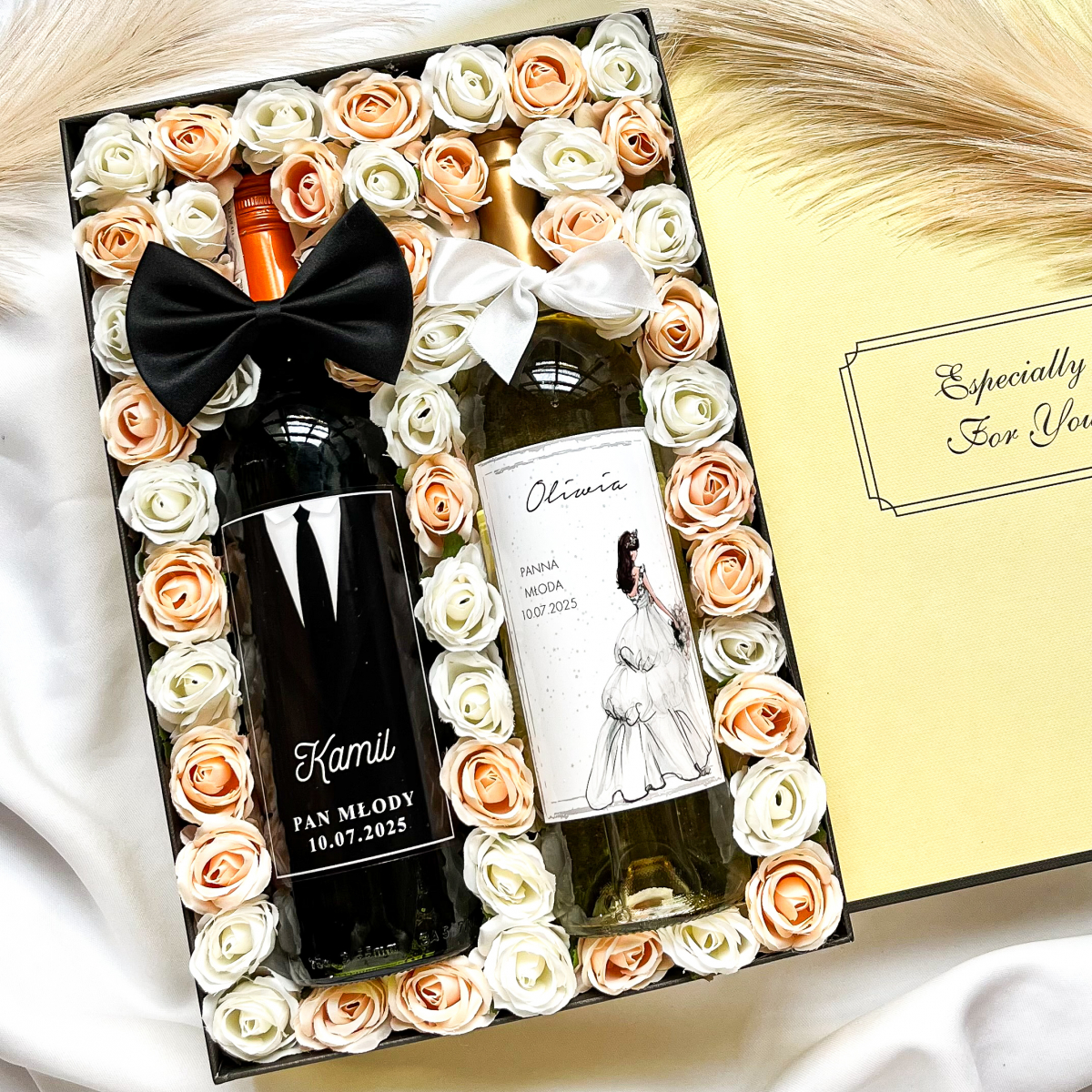 Każda butelka w zestawie ozdobiona jest personalizowaną etykietą, przygotowaną specjalnie dla Młodej Pary. Jedna z nich skierowana jest do Pana Młodego, druga – do Panny Młodej. Możemy umieścić na nich: