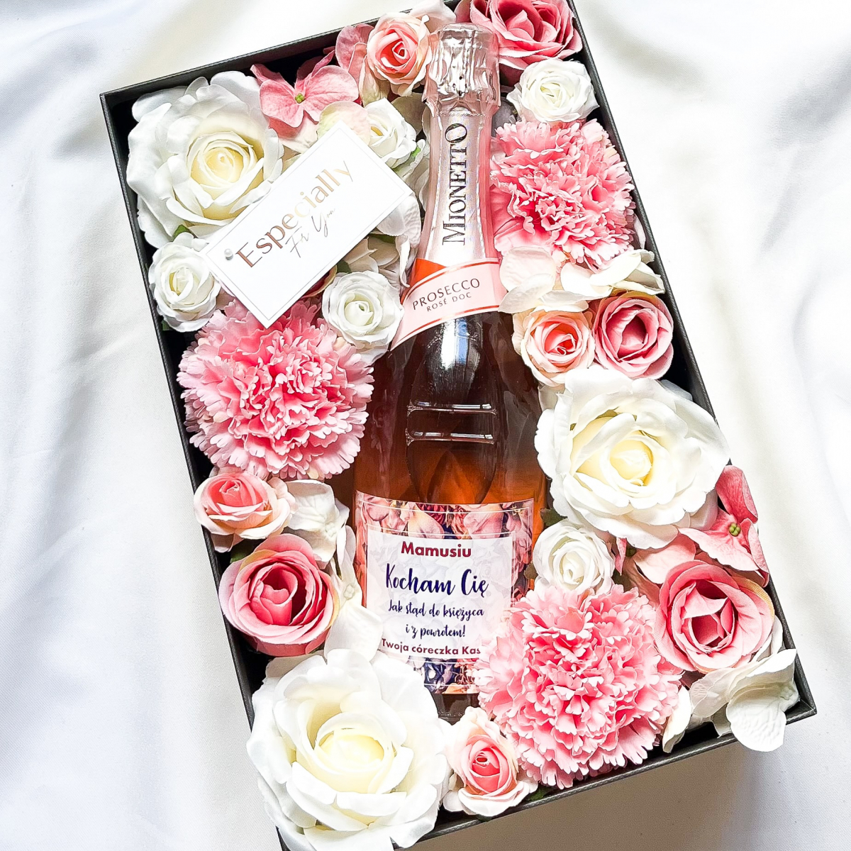 Butelka z Twoją dedykacją w obłędnym pudełku pełnym kwiatów podkreśli wyjątkowość chwili.
