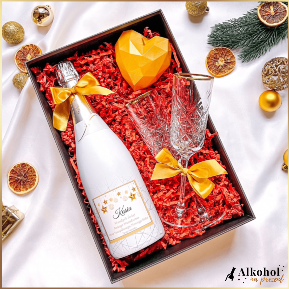 W zestawie bożonarodzeniowym z szampanem Freixenet Ice znajdują się ponadto znajdują się ponadto kryształowe kieliszki do degustacji tego rodzaju trunków oraz świeczka. Całości dopełnia okolicznościowe opakowanie oraz personalizowana etykieta, na której umieszczamy przesłaną przez Ciebie treść dedykacji czy życzeń świątecznych.