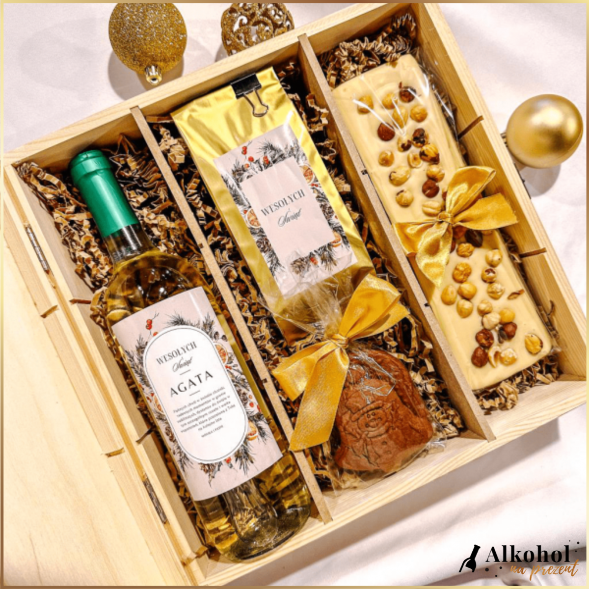 zestawie bożonarodzeniowym z butelką wina białego znajdują się ponadto kawa, ciasteczka w stylu świątecznym, czekolada owocowa. Całości dopełnia skrzynka z wypełnieniem ze wstążką (patrz drugie zdjęcie).