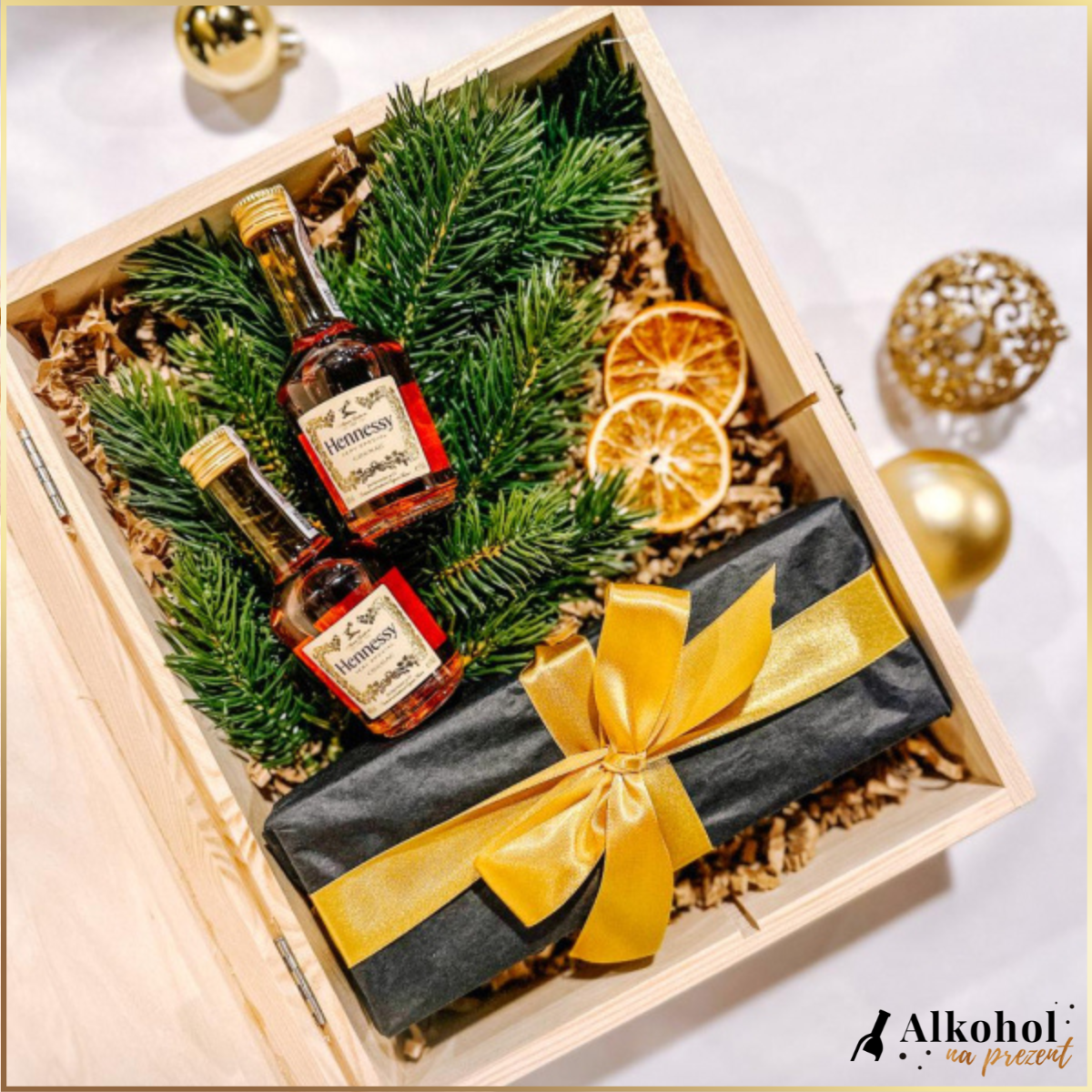 ŚWIĄTECZNY ZESTAW 2X HENNESSY MINI + PIERNIKI W SKRZYNCE Z NADRUKIEM- ZESTAW PREZENTOWY NA BOŻE NARODZENIE