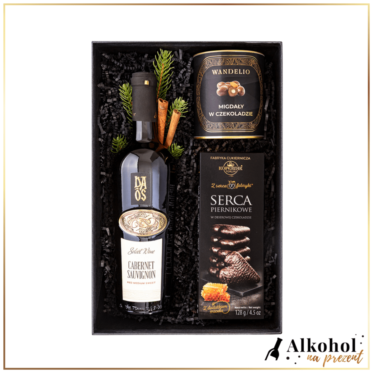 Elegancki zestaw świąteczny, w którym czerwone wino spotyka się z delikatną słodyczą świątecznych przysmaków. To doskonały upominek firmowy dla kontrahentów, klientów lub współpracowników — klasyczny, stylowy i gotowy do wręczenia.
