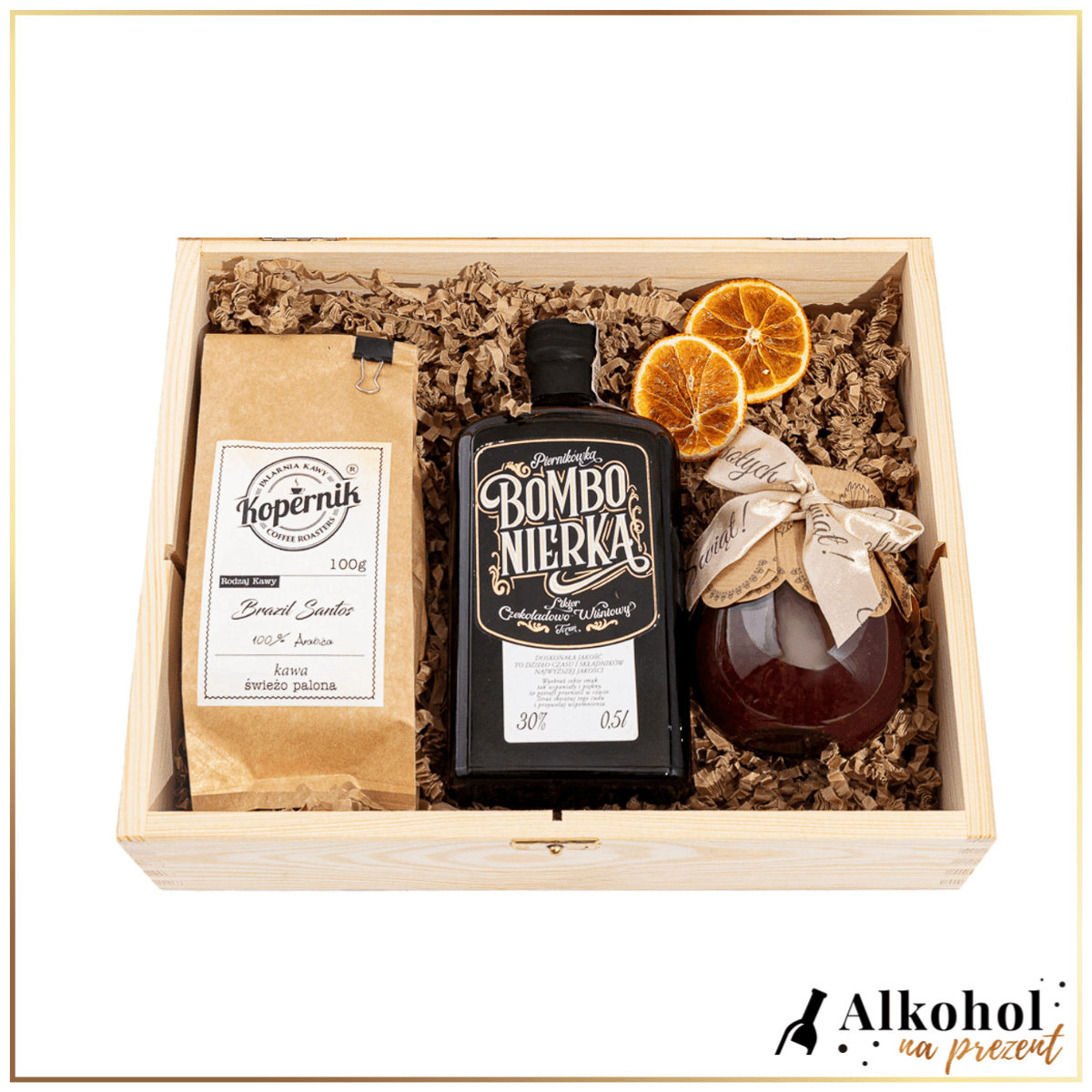 Całość zamknięta w eleganckiej, drewnianej skrzynce z naklejką świąteczną . To gotowy do wręczenia prezent świąteczny z alkoholem – idealny dla koneserów słodkich trunków i miłośników świątecznych smaków.