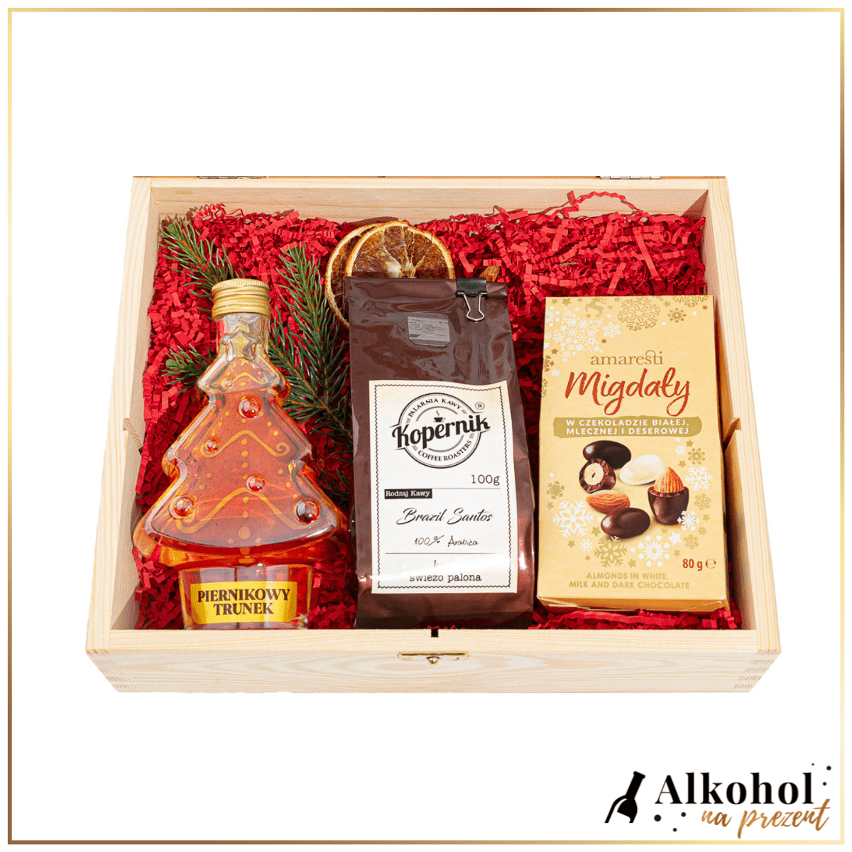ŚWIĄTECZNY ZESTAW LIKIER PIERNIKOWY TRUNEK CHOINKA W SKRZYNCE ŻYCZENIAMI - ZESTAW NA BOŻE NARODZENIE