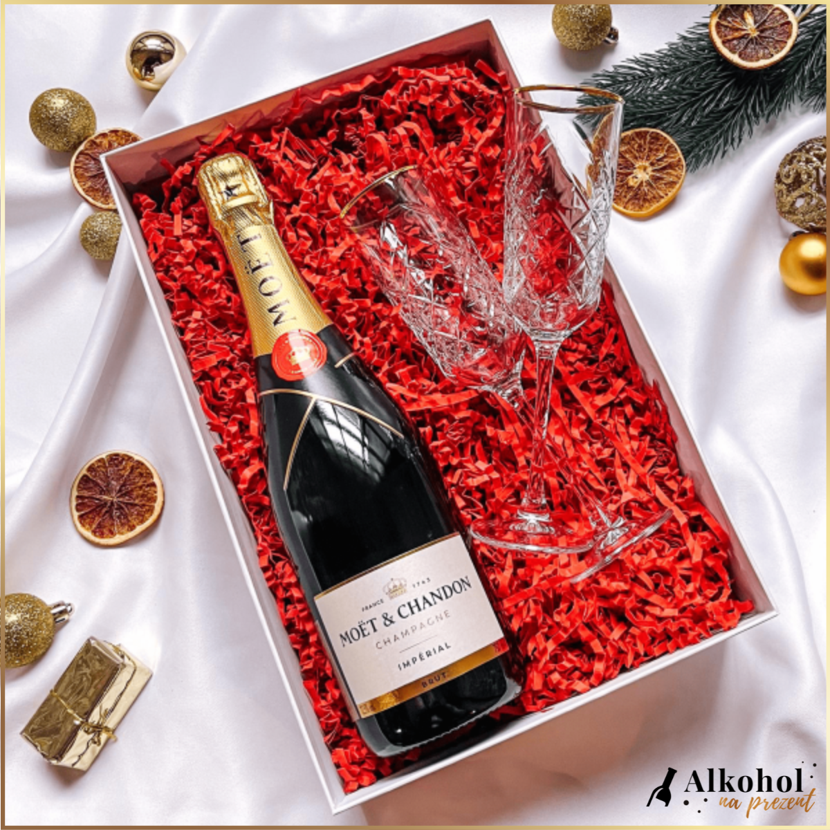 We wnętrzu znajduje się butelka Moët & Chandon Brut Imperial oraz kryształowe kieliszki. Moët & Chandon Brut Imperial jest jednym z najbardziej znanych i cenionych szampanów sygnowanych kultową marką Moët & Chandon – łączy w sobie aromatów cytrusów, orzechów i zbóż, które tworzą harmonijną całość. Prawdziwy szampan na Boże Narodzenie może być upominkiem, który zostanie wykorzystany w najlepszych okolicznościach do celebracji, za to pudełko długi czas przypomina o okolicznościach wręczenia i może stać się ozdobą, pamiątką. Ekskluzywny zestaw alkoholu w połączeniu z kryształowymi kieliszkami nada temu upominkowi jeszczcze więcej klasy. A dwa kieliszki pozwolą na wspólne delektowanie się trunkiem.