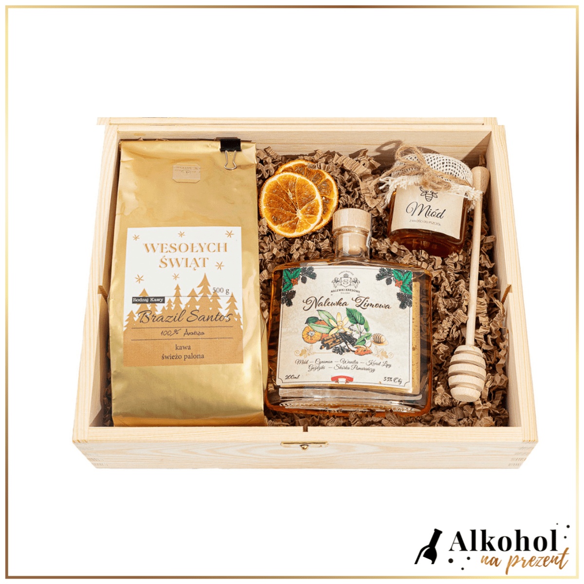 Świąteczny zestaw prezentowy z kawą, nalewką i miodem