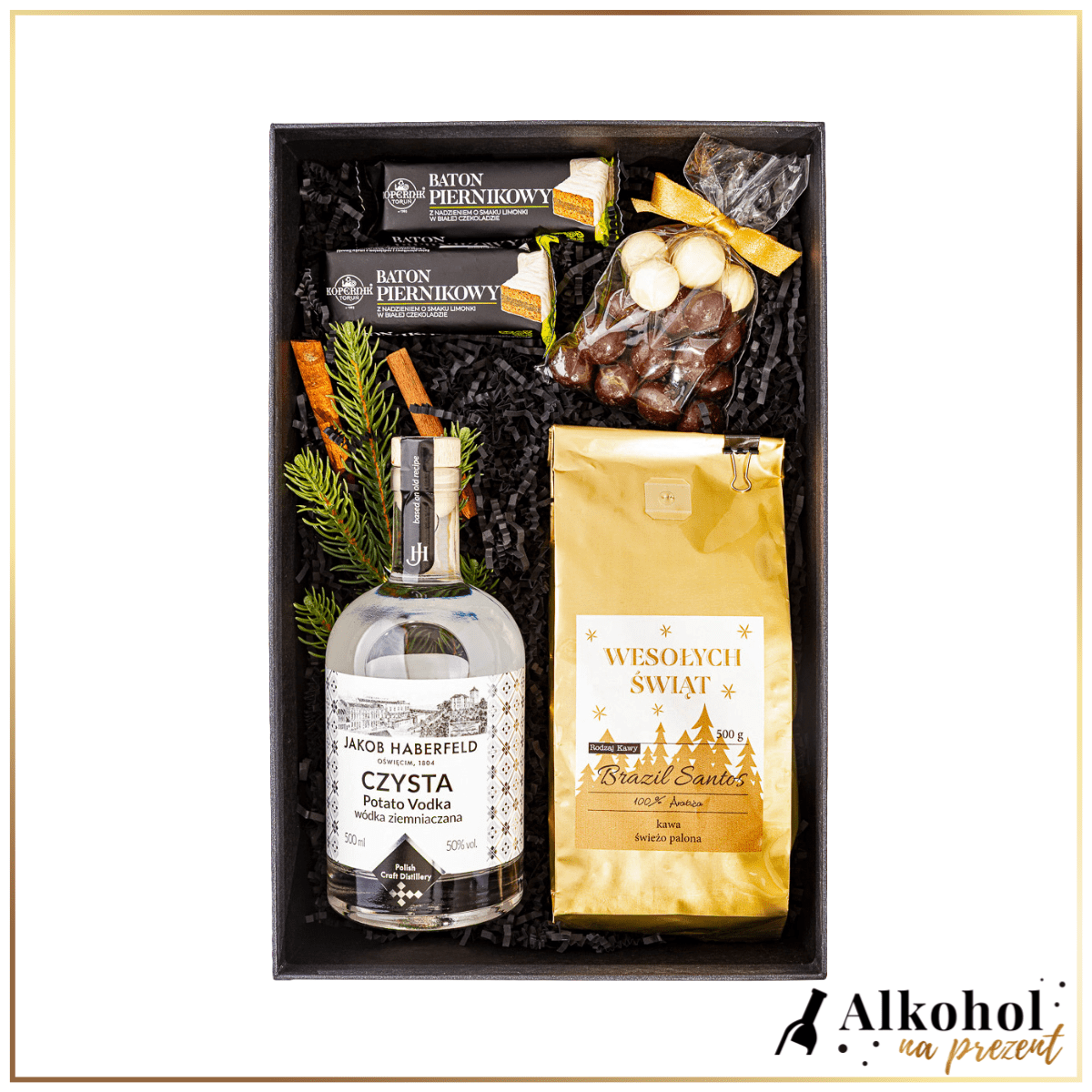 Stylowy zestaw świąteczny, który łączy polskie rzemiosło, smak i świąteczną atmosferę. Rzemieślnicza wódka ziemniaczana Jakob Haberfeld w towarzystwie aromatycznej kawy i tradycyjnych pierników to idealny prezent dla firm ceniących elegancję i jakość.