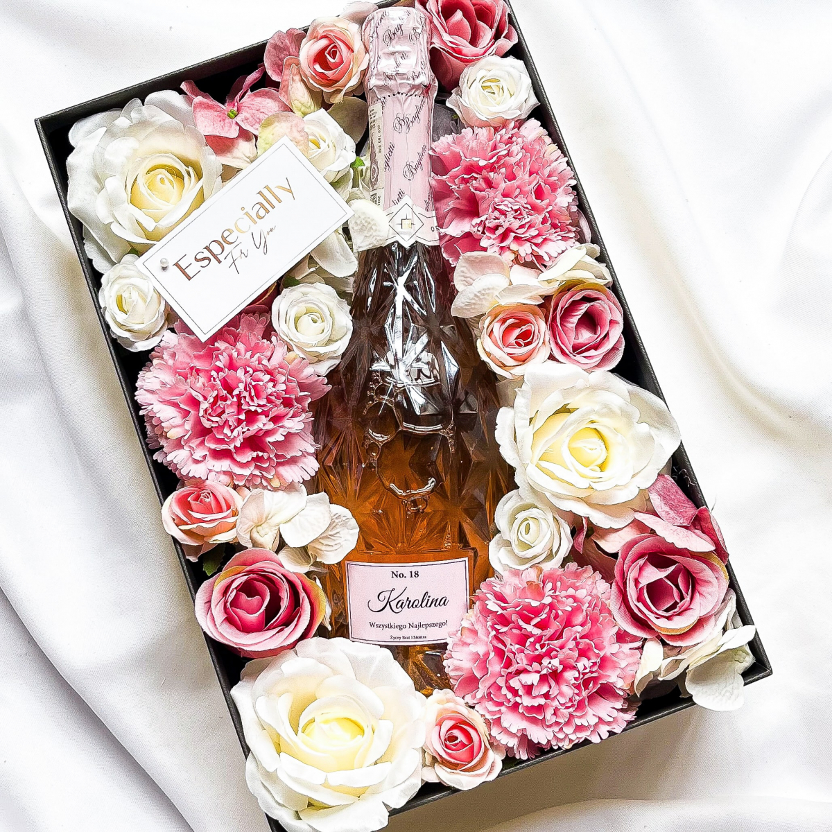 • Elegancki Flowerbox: Prosecco umieszczone jest w stylowym pudełku prezentowym typu flowerbox, które wypełnione jest wysokiej jakości sztucznymi kwiatami. Kompozycja kwiatowa jest piękna, trwała i stanowi wspaniałą dekorację, która pozostanie z obdarowaną osobą na długo.