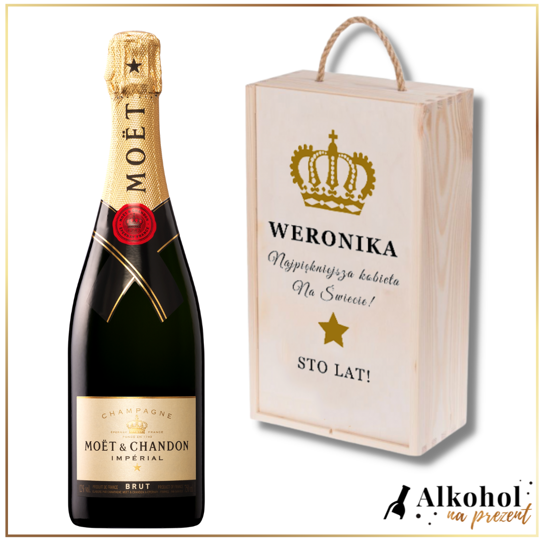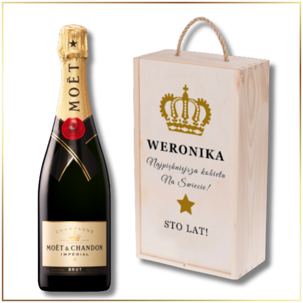 URODZINOWY SZAMPAN MOET & CHANDON BRUT IMPERIAL W DREWNIANEJ SKRZYNCE Z WŁASNYM TEKSTEM