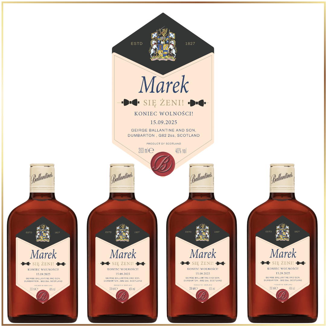 Zestaw mini butelek bourbonu z personalizacją to idealny dodatek na wieczór kawalerski, który łączy w sobie styl, charakter i wyjątkowy smak. Każda butelka zawiera wyselekcjonowany bourbon o głębokim aromacie i bogatym bukiecie, który doskonale podkreśla atmosferę męskiego świętowania. Personalizowane etykiety nadają całości unikalnego charakteru – możesz umieścić na nich imię przyszłego Pana Młodego, datę imprezy lub zabawne hasło, które wywoła uśmiech na twarzy każdego z uczestników. Ten elegancki zestaw świetnie sprawdzi się jako upominek dla gości, element dekoracyjny imprezy lub pamiątka z niezapomnianego wieczoru. Dbałość o szczegóły, jakość trunku oraz indywidualny charakter każdej butelki sprawiają, że to nie tylko praktyczny gadżet, ale także stylowy akcent podkreślający wyjątkowość chwili. Zestaw bourbonów z personalizacją to strzał w dziesiątkę dla każdego, kto ceni sobie klasę, dobrą zabawę i oryginalne pomysły na wieczór kawalerski.