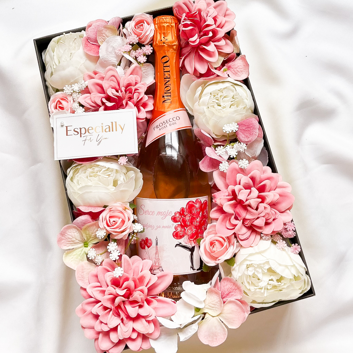 Niech butelka z Twoją dedykacją w obłędnym pudełku pełnym kwiatów będzie równie wyjątkowa, jak Wasz zaręczynowy dzień.