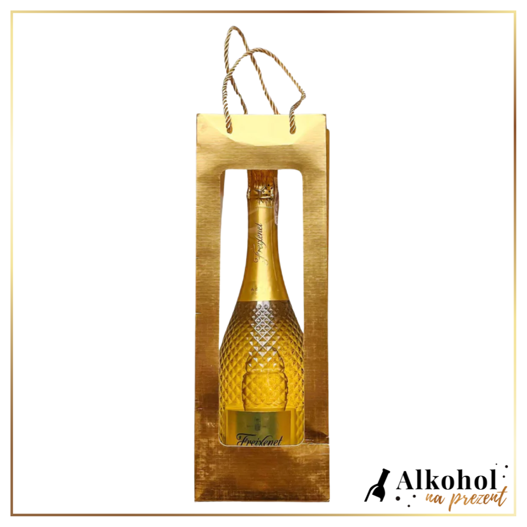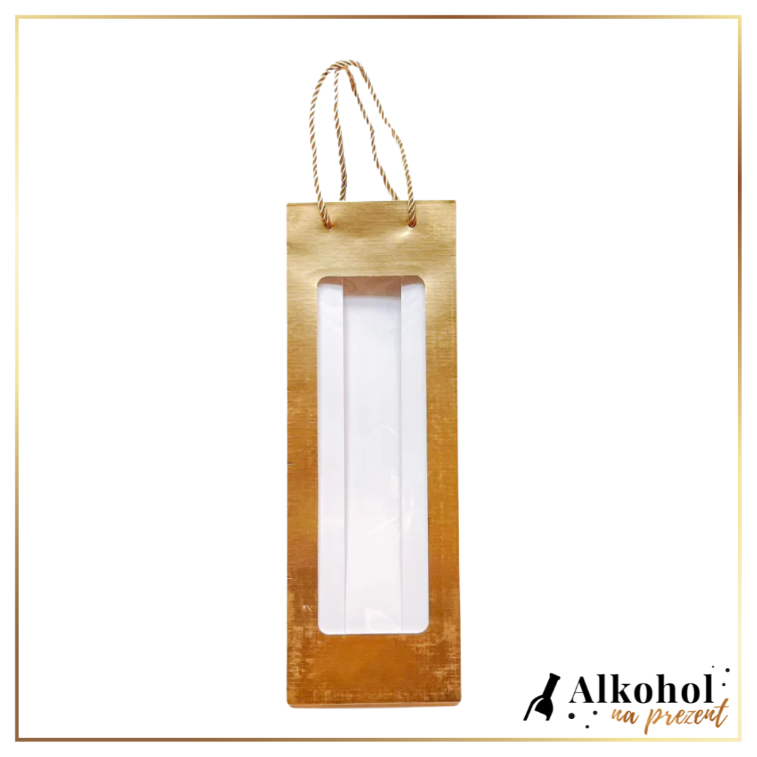 Stylowa i praktyczna torebka upominkowa wykonana z wysokiej jakości, sztywnego papieru w klasycznym złotym kolorze. Idealnie dopasowana do jednej butelki alkoholu (wino, whisky, nalewka itp.). Jej wyjątkowym atutem jest przezroczyste okienko z tworzywa sztucznego, które efektownie eksponuje zawartość, nadając prezentowi elegancki i nowoczesny charakter.