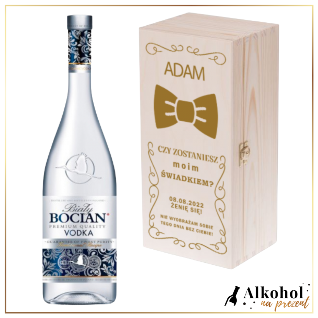 Wódka to najczęstsza odpowiedź na pytanie, jaki alkohol kupić dla świadka, wyjątkową okazję czy ślub. Butelka wódki będzie prezentem doskonałym niezależnie od wieku i płci. Bocian to tradycyjna polska wódka, która będzie odpowiednia do wręczenia na każdą okazję. Wódka w skrzynce z dedykacją to elegancki, oryginalny i luksusowy prezent. Jasna skrzynka z imieniem, wierszykiem, życzeniami czy specjalną dedykacją będzie prezentem podarowanym prosto z serca. Skrzynka z własnym tekstem to unikalny upominek skierowany do konkretnej osoby.
