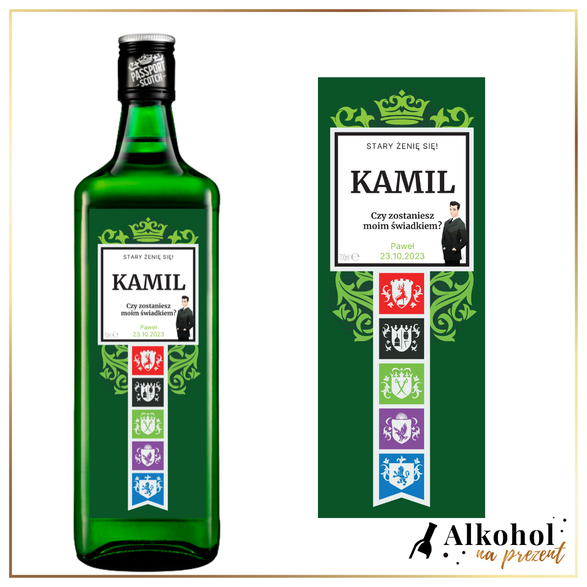 Rysunkowa grafika  z Panem Młodym nie pozostawia wątpliwości, jakiej okazji towarzyszy ten upominek. Treść podziękowań, prośby czy dedykacji podajesz nam w trakcie zamówienia, a my błyskawicznie podejmujemy się przygotowania alkoholu na prezent, który jest przede wszystkim unikatowy. Wybierasz także pudełko – tak, aby upominek był gotowy do wręczenia i prezentował się stosownie do pięknych okoliczności. Twój świadek zasługuje na godne uhonorowanie.